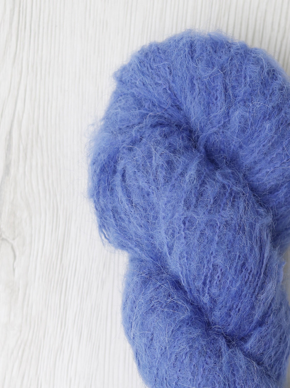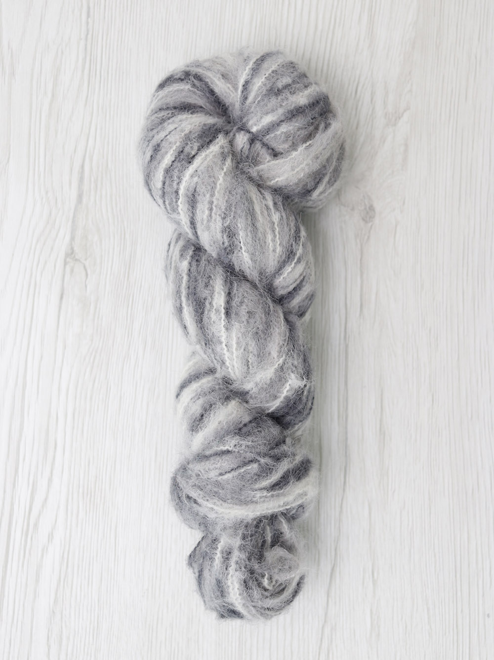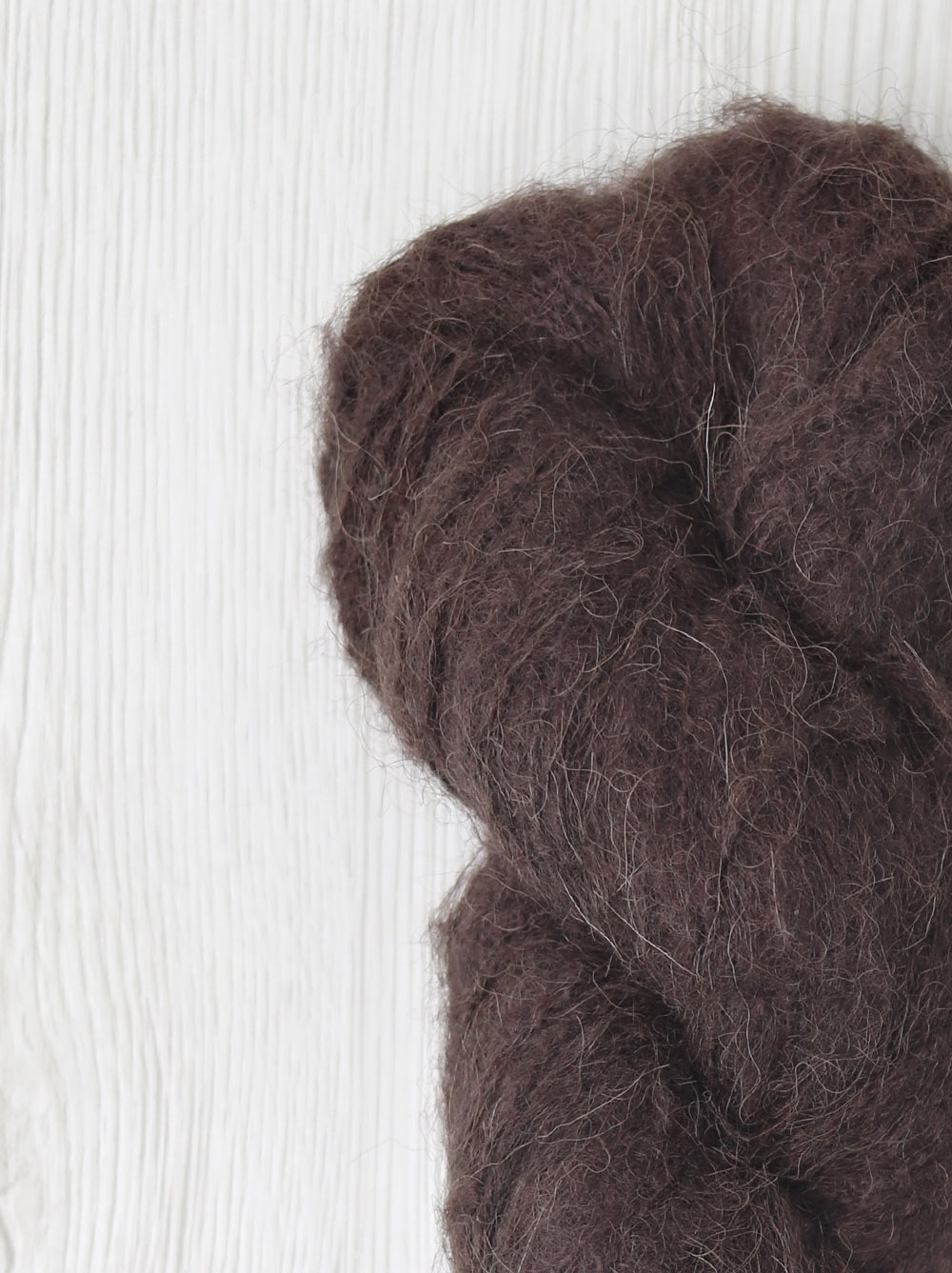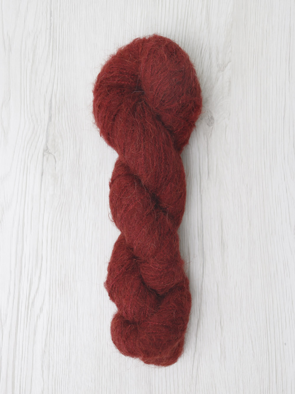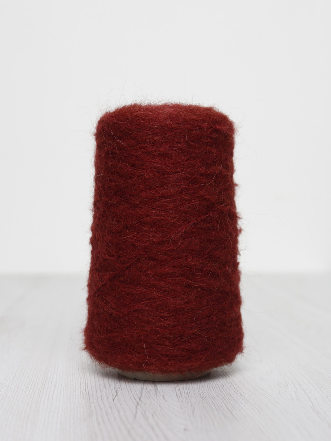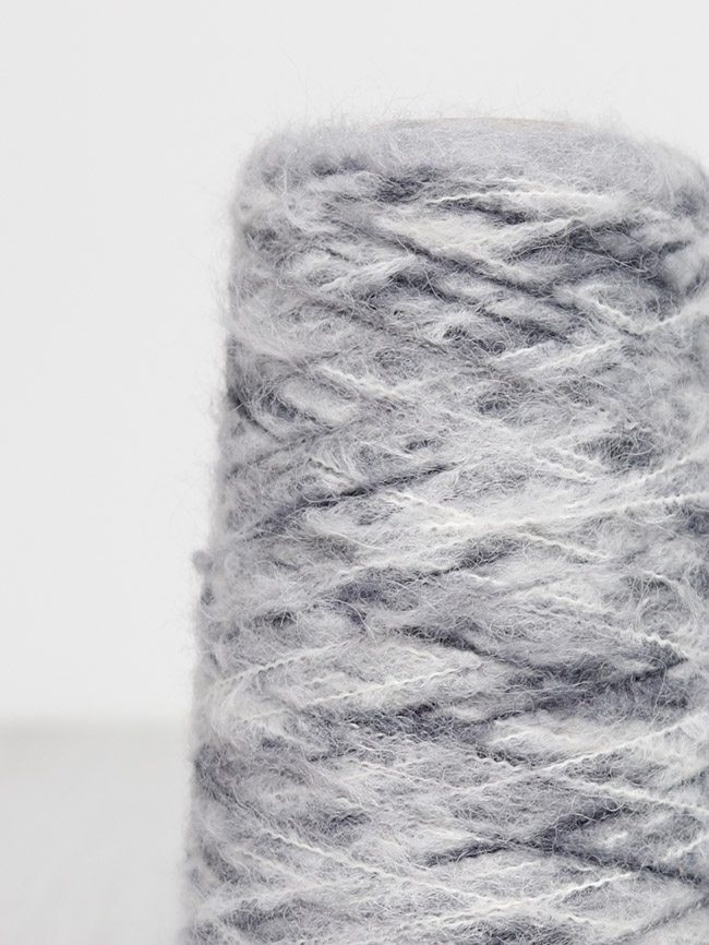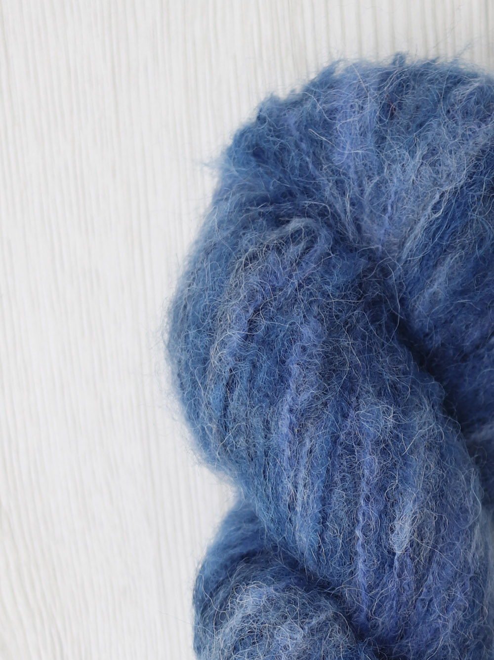 Cumbria is an alpaca yarn crafted from three twisted strands. Two ultrafine threads form the core, while a third, super-thin, fuzzy, and almost ethereal strand adds a voluminous, cotton-candy-like texture. This third alpaca strand determines the varying thickness of the entire yarn, depending on the concentration of its fluffy component. The resulting yarn has a firm structure but is also soft, thanks to the natural suppleness of alpaca fibers. Its slightly irregular volume, silky texture, and smooth glide make it a pleasure to work with.
