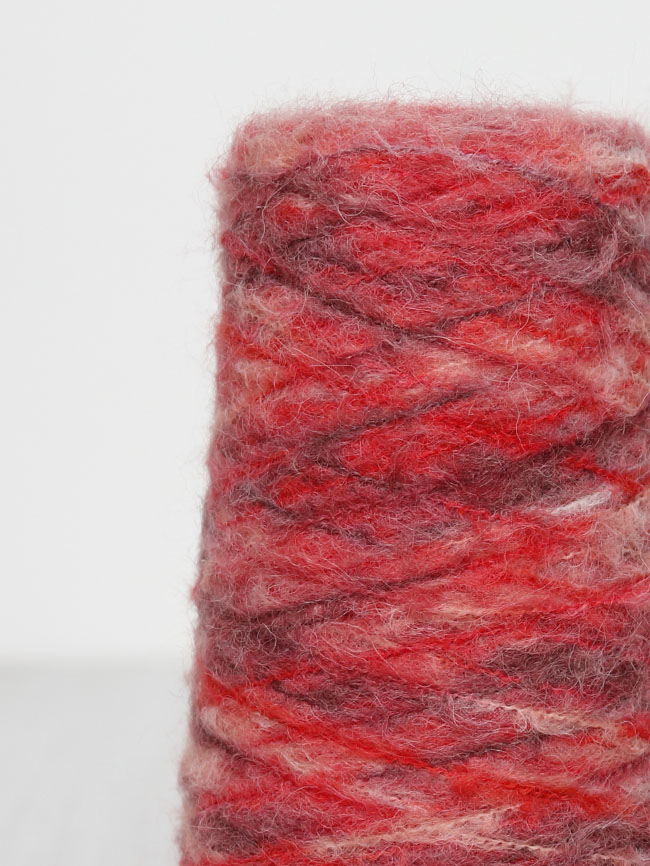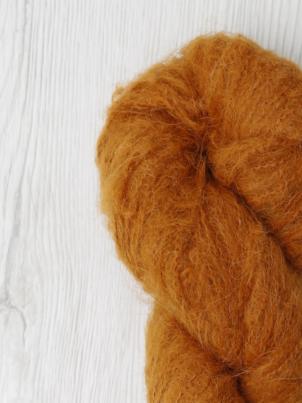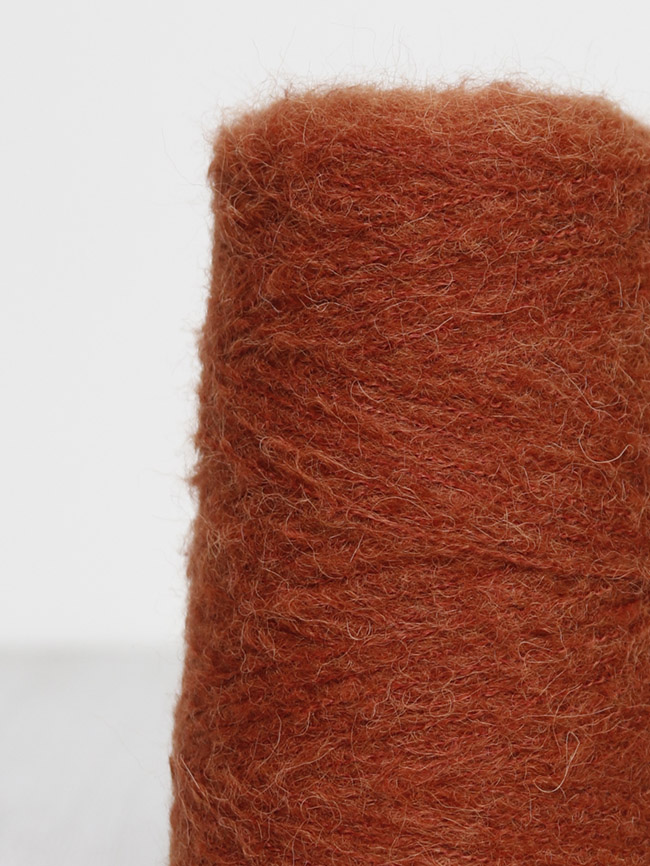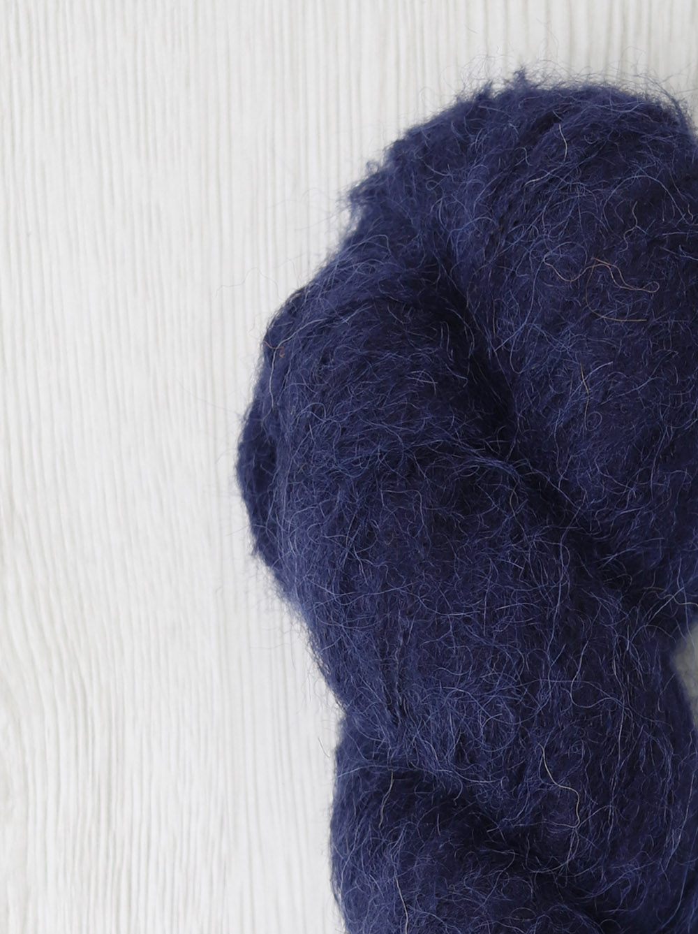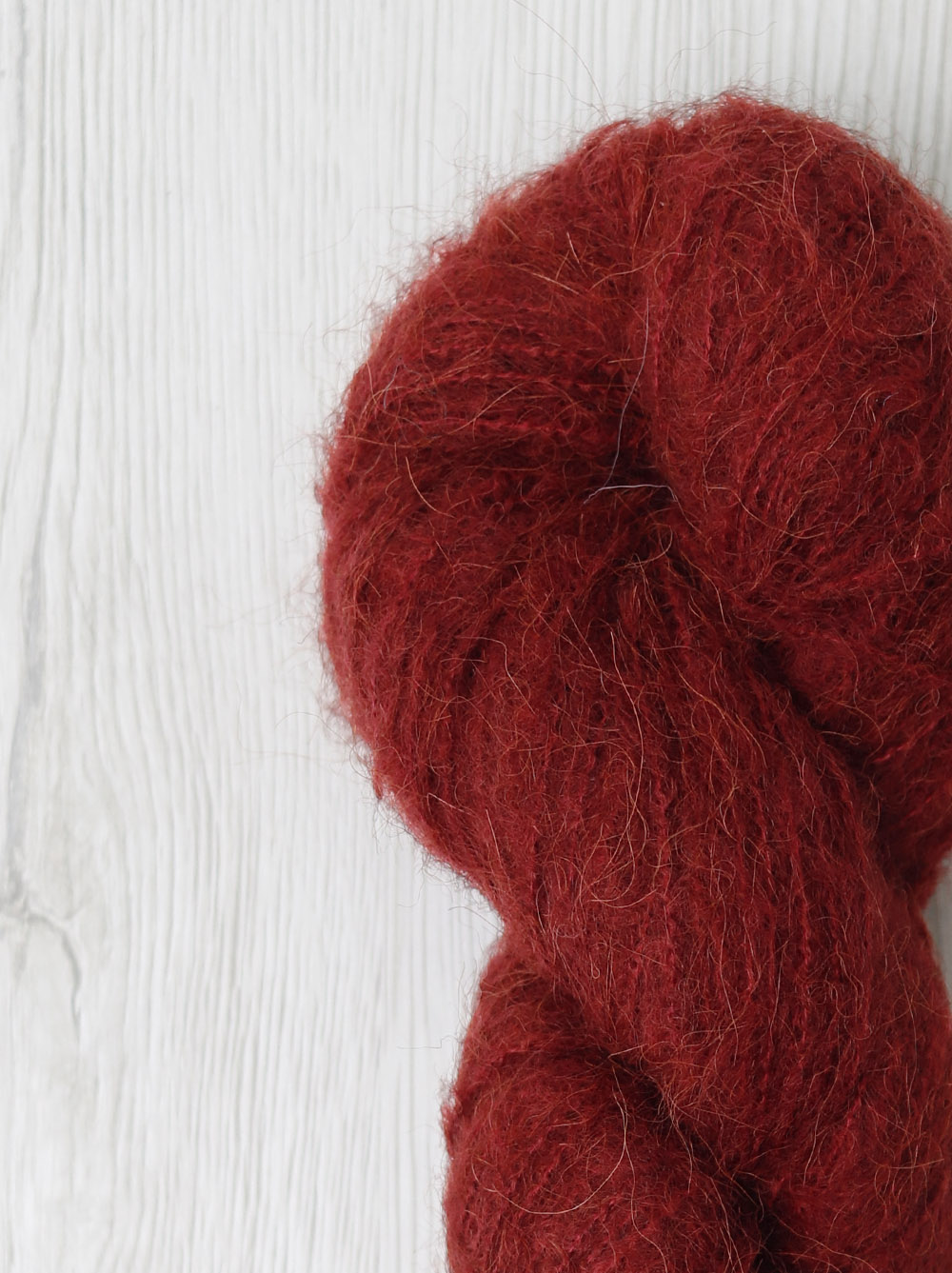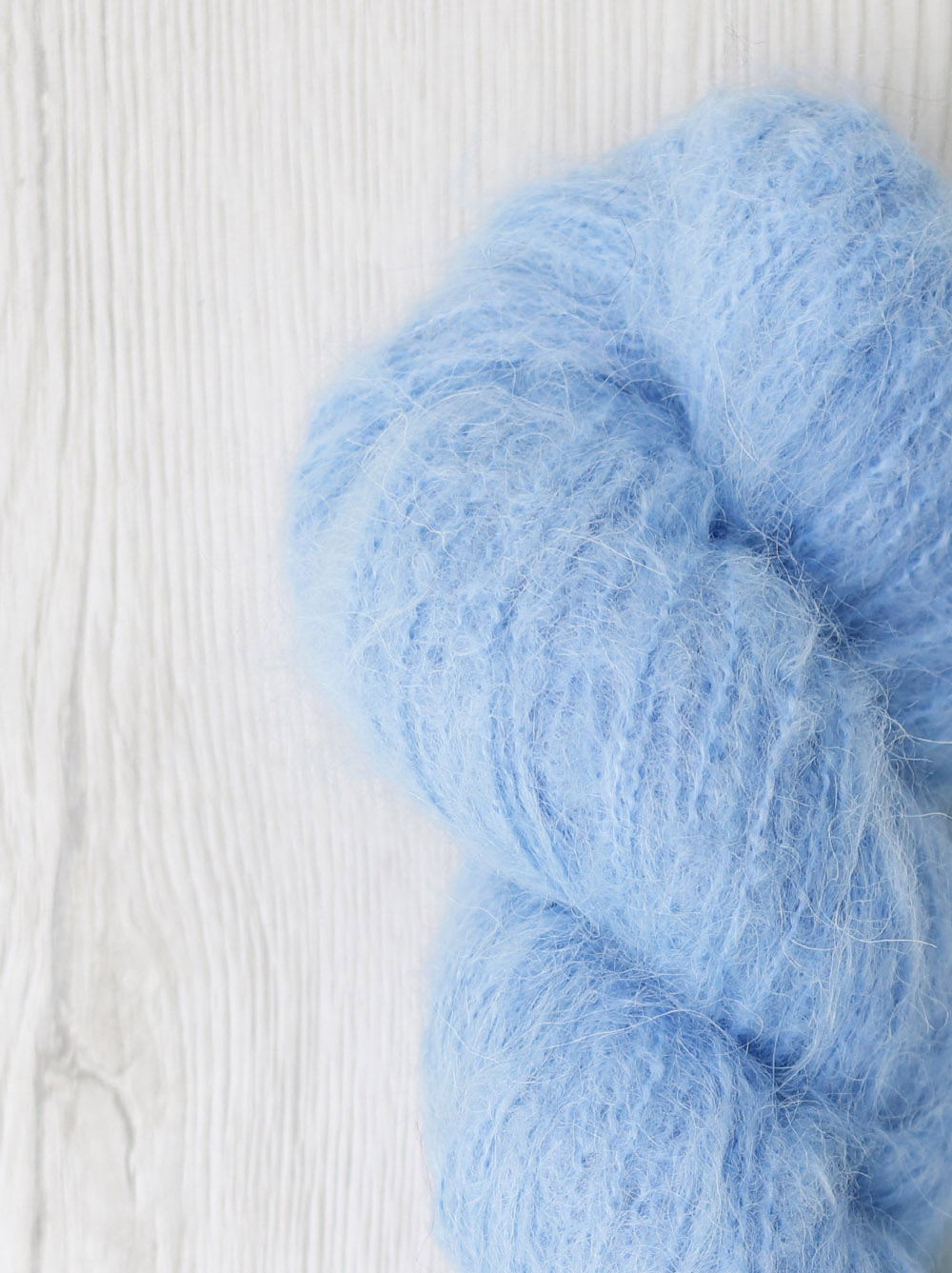 Cumbria is an alpaca yarn crafted from three twisted strands. Two ultrafine threads form the core, while a third, super-thin, fuzzy, and almost ethereal strand adds a voluminous, cotton-candy-like texture. This third alpaca strand determines the varying thickness of the entire yarn, depending on the concentration of its fluffy component. The resulting yarn has a firm structure but is also soft, thanks to the natural suppleness of alpaca fibers. Its slightly irregular volume, silky texture, and smooth glide make it a pleasure to work with.